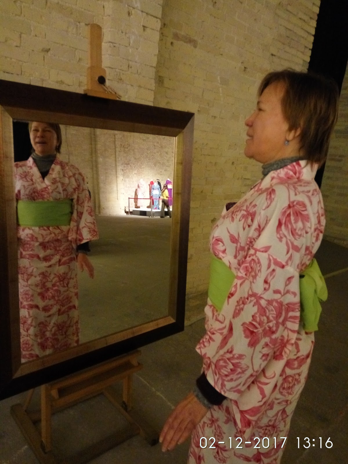 Яскраві враження та емоції особисто я отримала в залі, де були виставлені традиційні кімоно…різні… класичні, яскраві і більш стримані, довгі, з різних натуральних тканин, приємних на дотик. Мені, як фахівцеві, щоправда у минулому, було вдвічі приємно торкатися тонкого шовку та атласу, якісної тонкої бавовни та уявляти яскраві та насичені кольори цих вбрань. Задоволення моє збільшилось, коли цю неймовірну красу з яскравими рожевими квітами на білому тлі наділи на мене. Дівчина-волонтер на виставці охоче допомагала увійти в образ такої собі Чіо-Чіо-сан. Виявилось, що вдягати кімоно значно довше, аніж знімати його. Особливого шарму моєму образу надав яскраво салатовий пасок довжиною до 2,5 метрів, що ним обвили мій стан. Для цього мені довелось крутитись намотуючи пояс на себе. В довершення кінці поясу були зав’язані у такий кокетливий бант нижче спини. Моєму образу не вистачало тільки дерев’яних японських стукалок та своєрідного макіяжу. Все ж таки одяг впливає на емоційний стан та настрій жінки і мені легко було уявити себе Чіо-Чіо-сан. До того ж такий одяг робить фігуру стрункою та елегантною. Знімаючи з мене кімоно, дівчина-волонтер зробила всього кілька рухів і я знову перетворилась на українку.